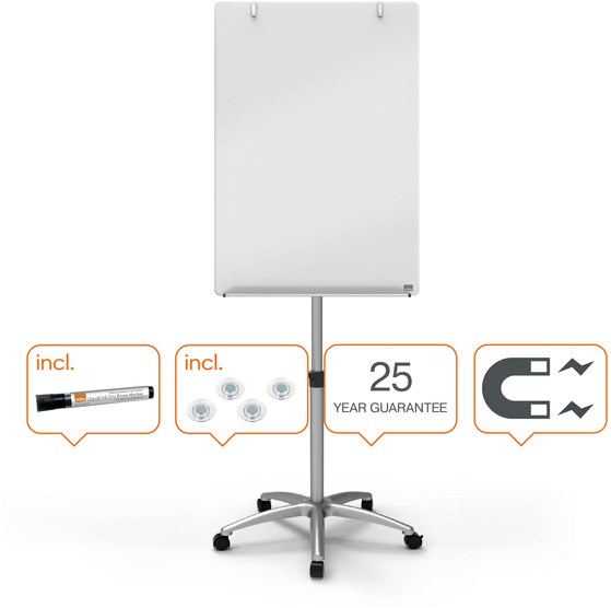 Mobiele, magnetische flipover met een bord van gehard 4 mm dik veiligheid glas