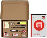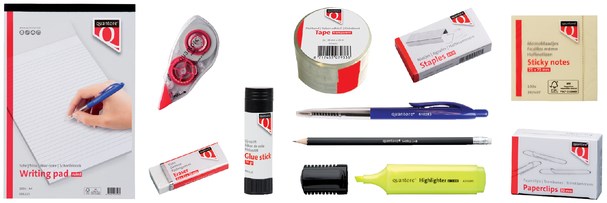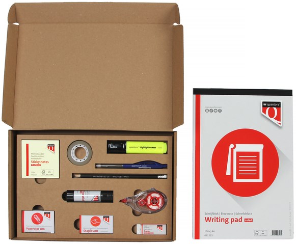 Inhoud koffer: Quantore huismerk catalogus, schrijfblok, zelfklevend memoblok, plakband, highlighter, pen, potlood, lijmstift correctieroller, paperclips en nietjes