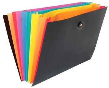 In deze documentenmap met 8 vakken kun je een heleboel papierwerk overzichtelijk archiveren. De waaiermap heeft een zwarte buitenkant en gekleurde vakken. De dossiermap sluit door middel van een elastiek met knoop