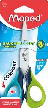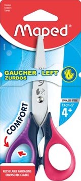 De Maped schaar Senso is speciaal ontworpen voor linkshandigen. Met een lengte van 13 cm is deze schaar perfect voor knutselen en andere knipwerkzaamheden. De messen zijn gemaakt van roestvrij staal, wat zorgt voor een lange levensduur. De schaar heeft symmetrische ogen, waardoor hij comfortabel in de hand ligt. Dankzij de zachte en soepele materie van de ogen knip je eenvoudig en zonder moeite. De schaar is verkrijgbaar in verschillende geassorteerde kleuren, zodat je altijd een leuke keuze hebt. Deze schaar wordt geleverd op een blisterverpakking, wat het ook handig maakt om cadeau te geven.