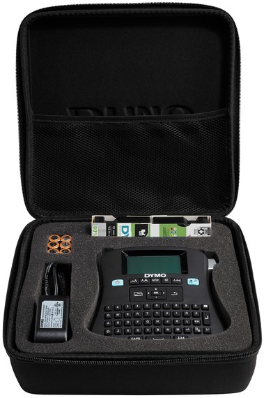 - Labeltape, stroomadapter en stevige koffer