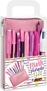 Inhoud: 1 x balpen 4 colours Shine roze 1 x fineliner Intensity roze 1 x balpen Cristal Fun 1,6 mm roze 1 x gelroller Illusion roze 1 x grafietpotlood Evolution Fluo roze 3 x markeerstift Grip in roze, fuchsia en purple 1 x vulpotlood MP 0,7 mm met roze lichaam 1 x pennenzak