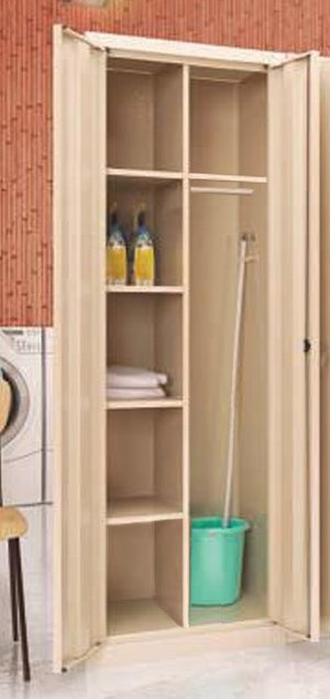 Deze kast is in drie uitvoeringen leverbaar; met vier legplanken (SMD 60), vier legplanken en een garderobevak (SMD 61), en de variant met planken en een vak voor emmer en dweilstok (SMD62).