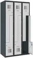 Zoek je een lockerkast die efficiënt omgaat met ruimte? Deze lockerkast van 90 cm breed heeft drie kolommen van elk 30 cm en in totaal zes L-vormige deuren. Zo ontstaat voor iedere gebruiker een volwaardig vak voor kleding en persoonlijke spullen, terwijl je dezelfde vloeroppervlakte behoudt. De stevige, gelaste stalen constructie met gesloten profielen zorgt voor extra stabiliteit en een lange levensduur. Ideaal voor kleedruimtes in sport, onderwijs of productieomgevingen.