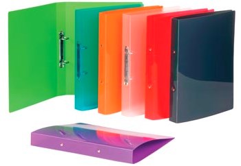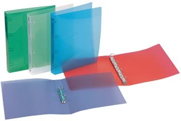 Voor A4 formaat. Uit PP. Met 2 ringen van 30 mm. Geassorteerde transparante kleuren: kristal, rood, groen, blauw, oranje, paars en antraciet.