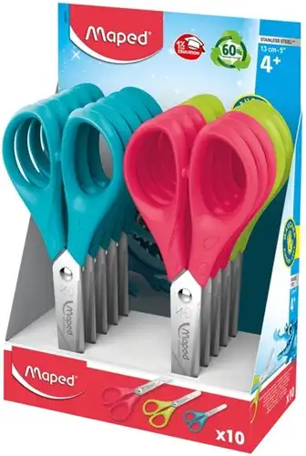 Deze schaar van Maped is speciaal ontworpen voor linkshandigen. Met afgeronde punten en ergonomische ringen is deze schaar veilig en comfortabel in gebruik. Ideaal voor knutselprojecten, schoolwerk of hobby's. De schaar heeft een lengte van 13cm en wordt geleverd in een verpakking van 10 stuks, wat het handig maakt voor groepen of gezinnen.