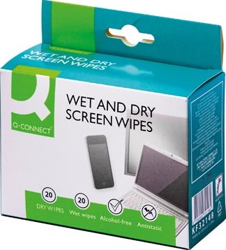 Q-CONNECT Wet & Dry beeldschermreinigingsdoekjes, doos van 20 paar (1 Wet en 1 Dry)