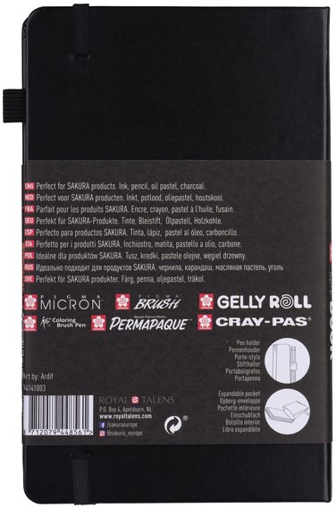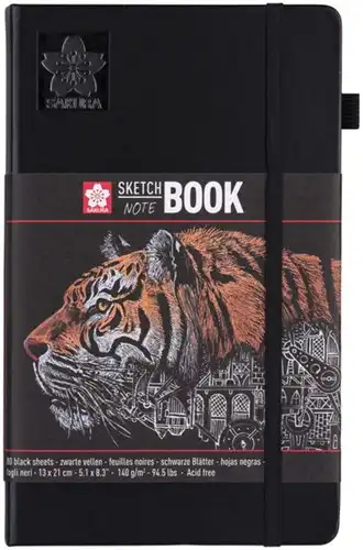 In zwart gebonden Sakura schetsboek met zwarte pagina's. Een ideaal schetsboek voor het tekenen op locatie en het oefenen van technieken (inkt/potlood/oliepastel/houtskool).