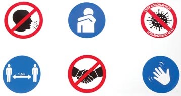 Sticker met 6 symbolen voor veiligheid en hygiënevoorschriften. Ft 100 x 50 cm.