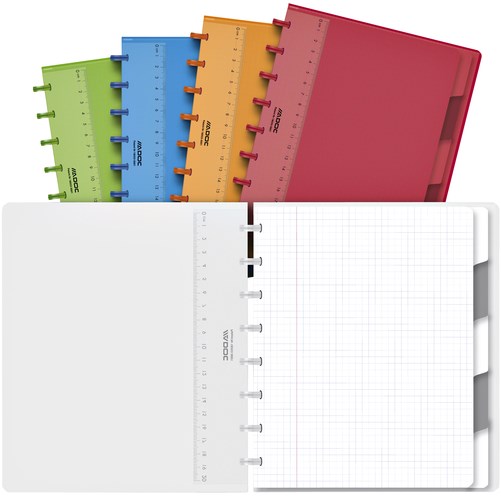 A5 ADOC ringschrift met 144 geruite (5x5mm) bladzijden van extra wit 90gr PEFC schrijfpapier waarop iedere pen zich thuis voelt en met 5 tabbladen, die door de 8 ADOC ringen eenvoudig van positie kunnen gewisseld, toegevoegd of weggenomen worden.