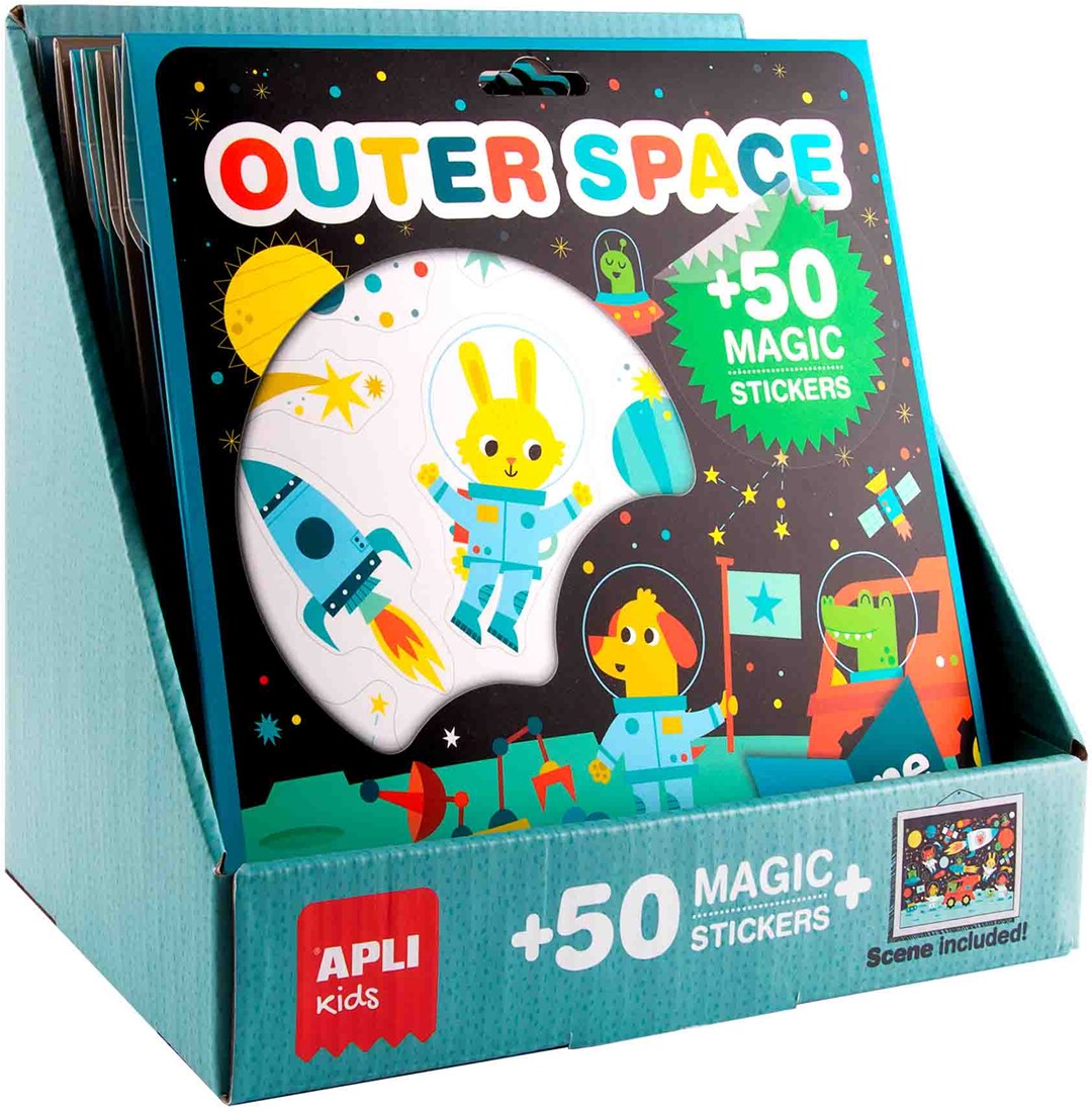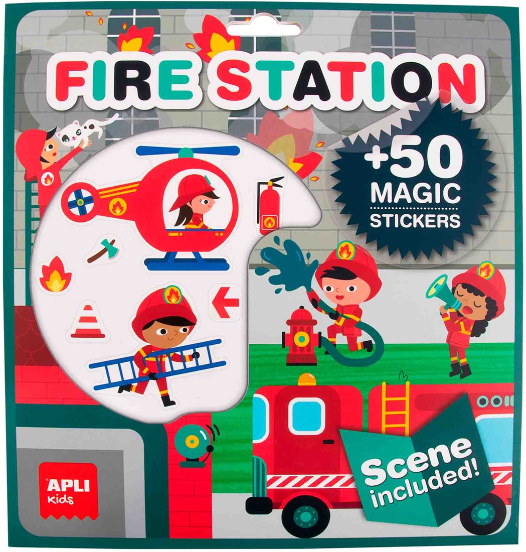 Weergave van verwijderbaar stickerspel met scène. Het spel bestaat uit het vullen van de scène met stickers van verschillende thema's: brandweerkazerne, dinosaurussen, de oceaan en de ruimte. Het display bevat 3 brandweerkazernepakketten, 3 Oceanen-pakketten, 3 dinosaurussenpakketten en 3 ruimtepakketten. Elk pakket bevat 1 scène en 4 verwijderbare stickervellen. Je kunt ze meer dan eens plakken, losmaken en hergebruiken! Spelen met stickers is een basisactiviteit waarmee kinderen de fijne motoriek kunnen ontwikkelen en aan meerdere vaardigheden en cognitieve vaardigheden kunnen werken.