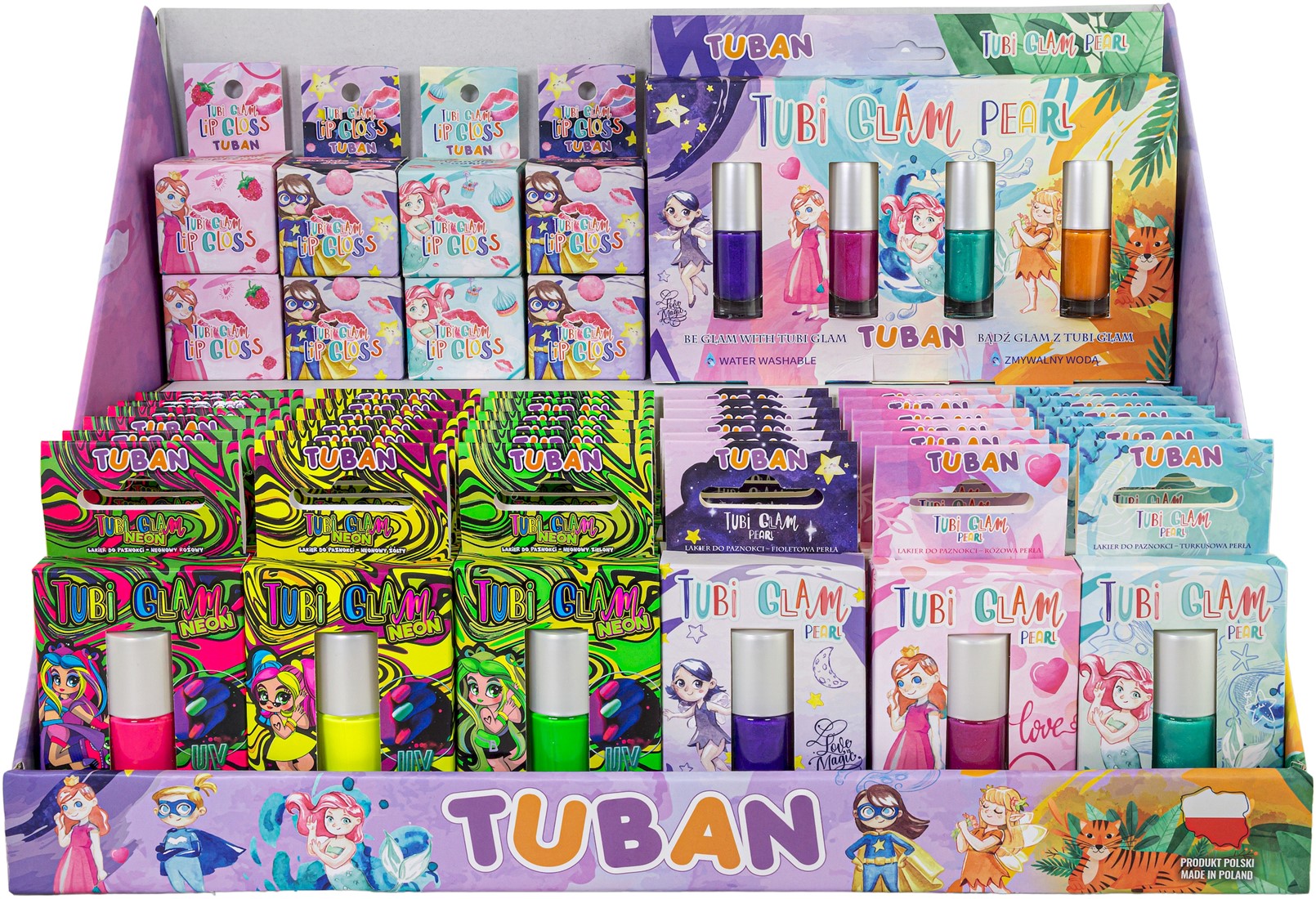 De set bevat: 2 sets Tubi Glam nagellakken, 46 enkele nagellakken, 8 Tubi Glam lipglosses. Tubi Glam nagellakken zijn afwasbaar met water. Dankzij hun bittere smaak helpen ze de gewoonte van nagelbijten te verminderen. Nagellakken en lipglosses zijn veilig voor kinderen. Ze ondergaan dermatologische tests. Het display is klaar om in de winkel te worden tentoongesteld, verzonden in een speciale doos. Geen montage vereist. 100% Pools product.