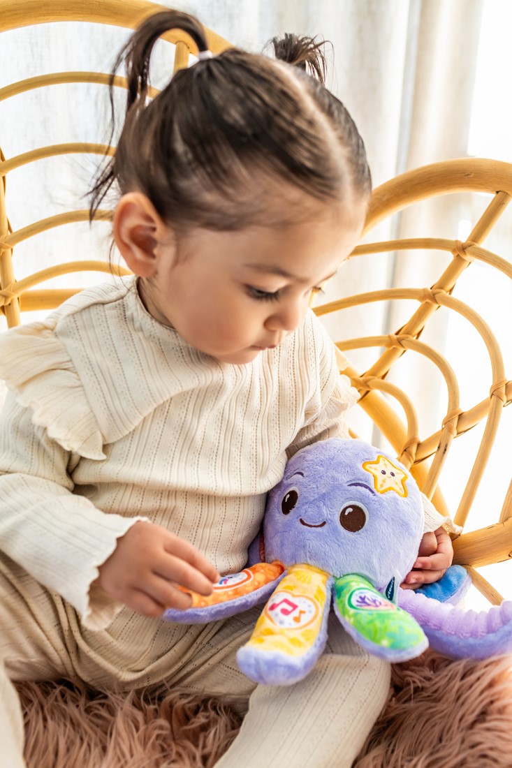 Deze lieve octopusknuffel heeft maar liefst 8 armen om je mee te knuffelen! De 8 armen bevatten verschillende materialen, texturen en patronen die de tastzin en de visuele ontwikkeling stimuleren. Druk op de 3 interactieve toetsen om lieve zinnetjes, grappige geluiden en gezongen liedjes te horen. Tijd om te knuffelen!