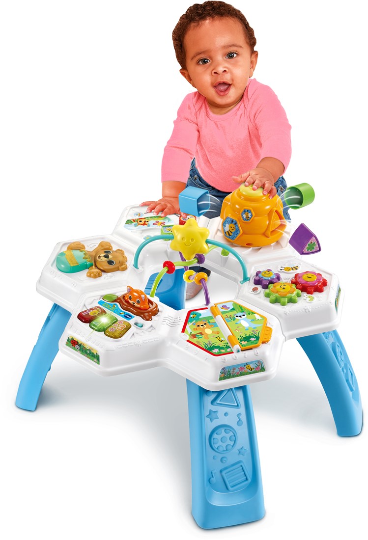 Deze Bezige Bij Speeltafel heeft vele beweegbare onderdelen die de fantasie prikkelen, de motorische ontwikkeling stimuleren en zorgen voor urenlang speelplezier! Sla de bladzijde van het boekje om of druk op de toetsen om vrolijke zinnetjes, gezongen liedjes en grappige geluiden te horen. Plaats de vormen in de bijenkorf en druk erop om te zien wat er gebeurt! Ga je mee op avontuur in de natuur?