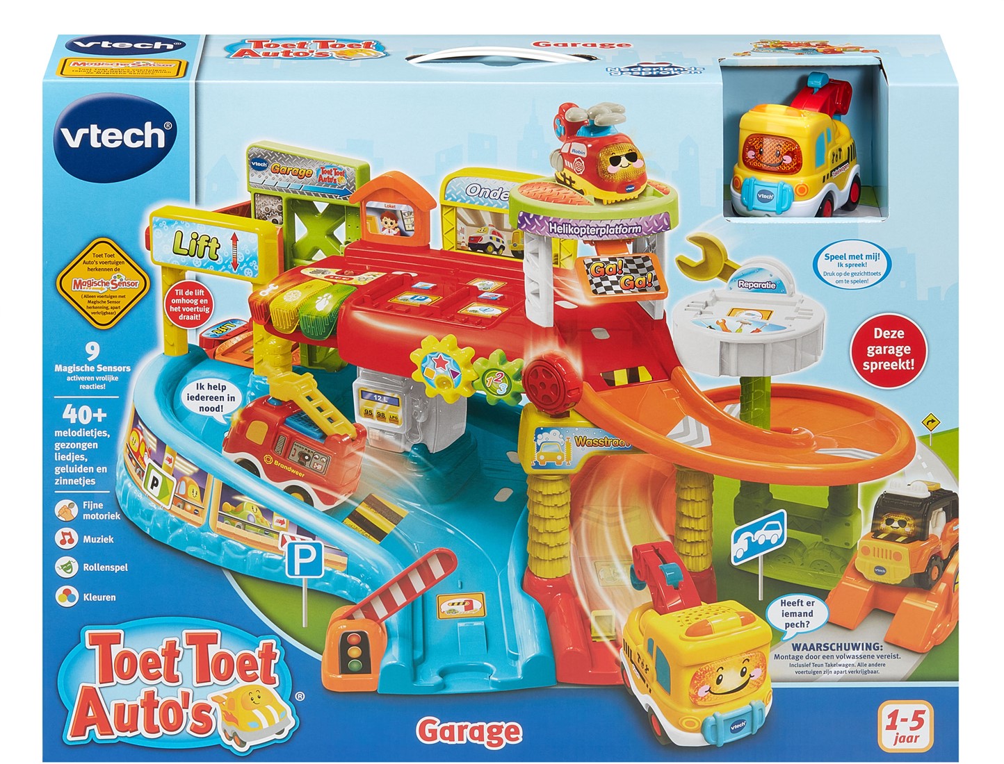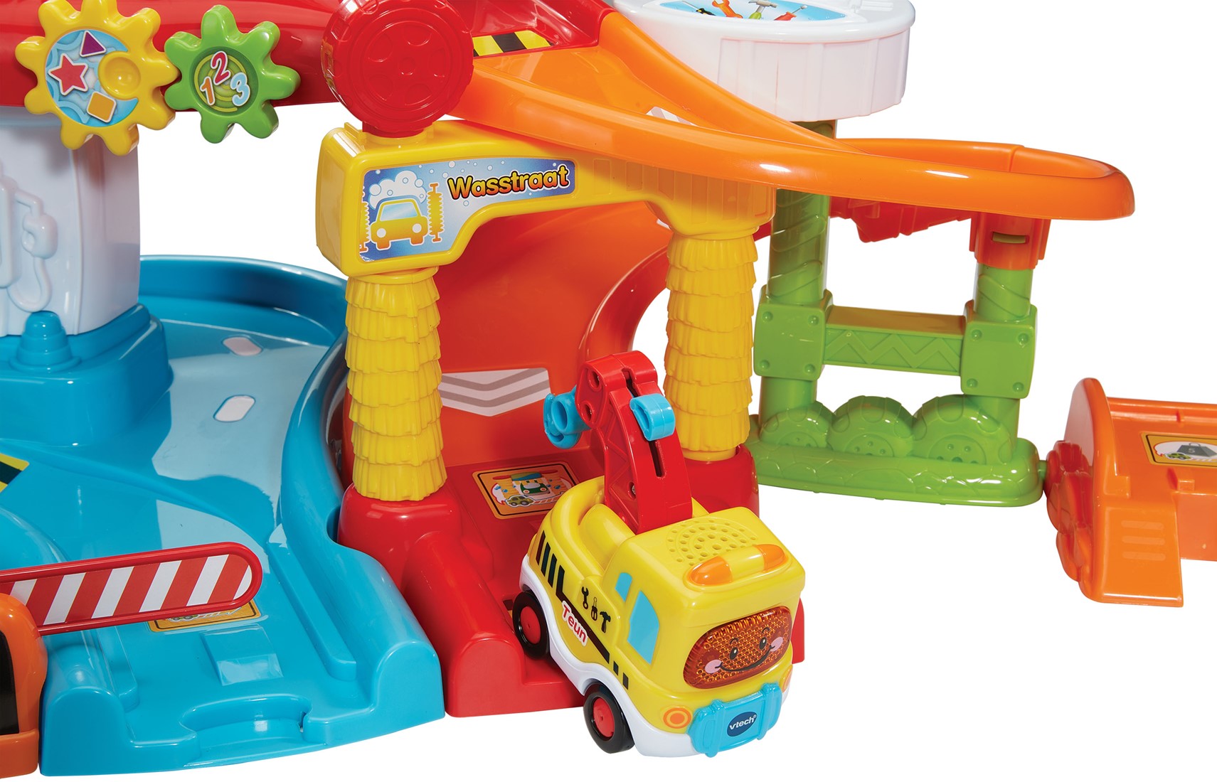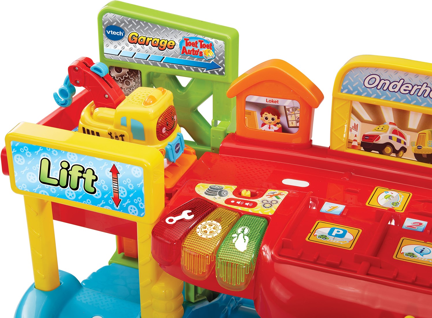 Rijd maar rond en maak plezier, want iedereen is welkom hier! Plaats Teun Takelwagen of andere Toet Toet Auto’s op de lift en beweeg de lift naar boven om het platform te zien draaien en het voertuig naar het parkeerdek te brengen. Druk op de knipperende toetsen om vrolijke reacties te horen en kennis te maken met kleuren. Rijd met een voertuig door de wasstraat of ga voor een onderhoudsbeurt naar het reparatie-platform. Verbind de garage met andere speelsets voor nog meer speelplezier.