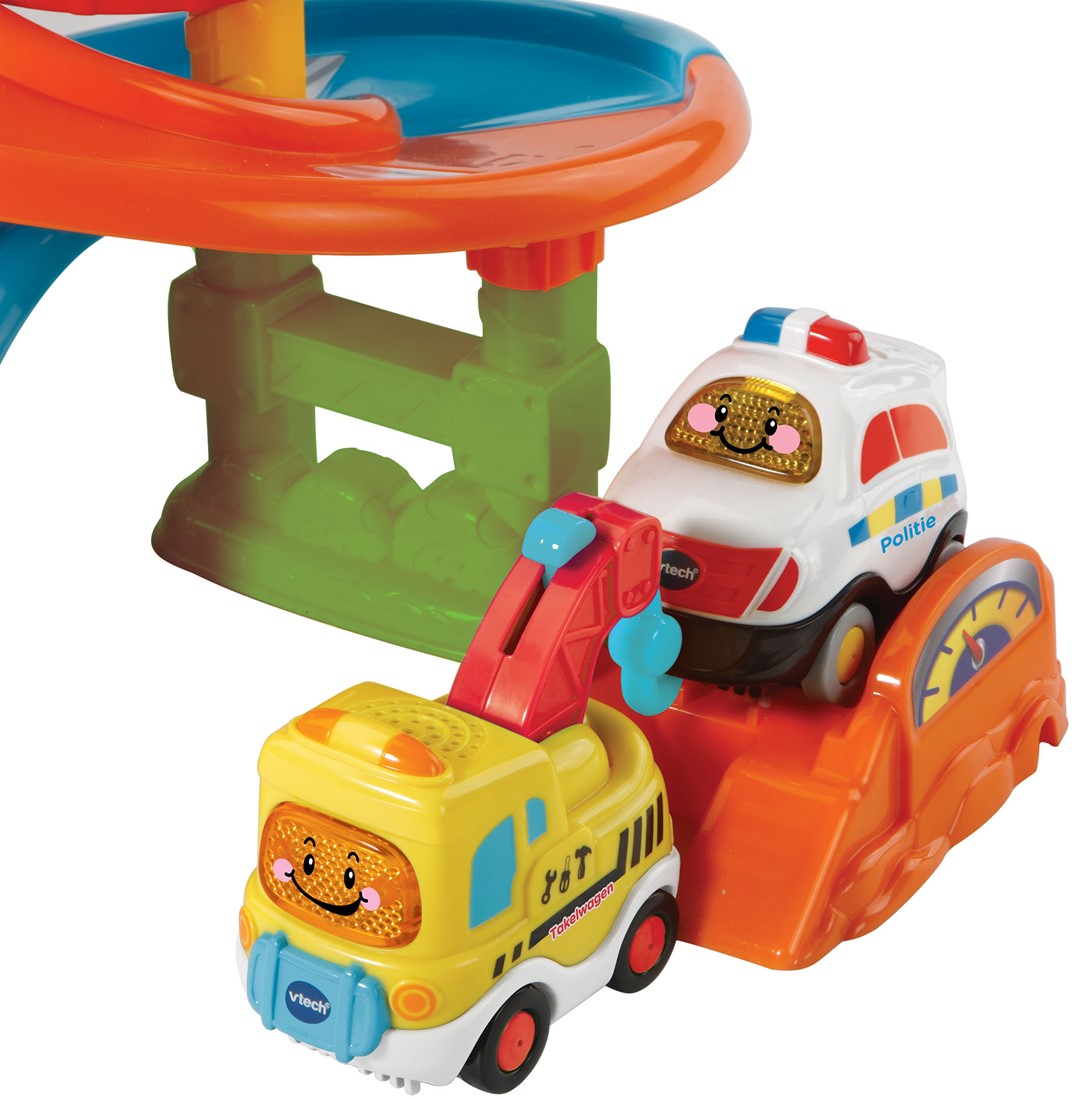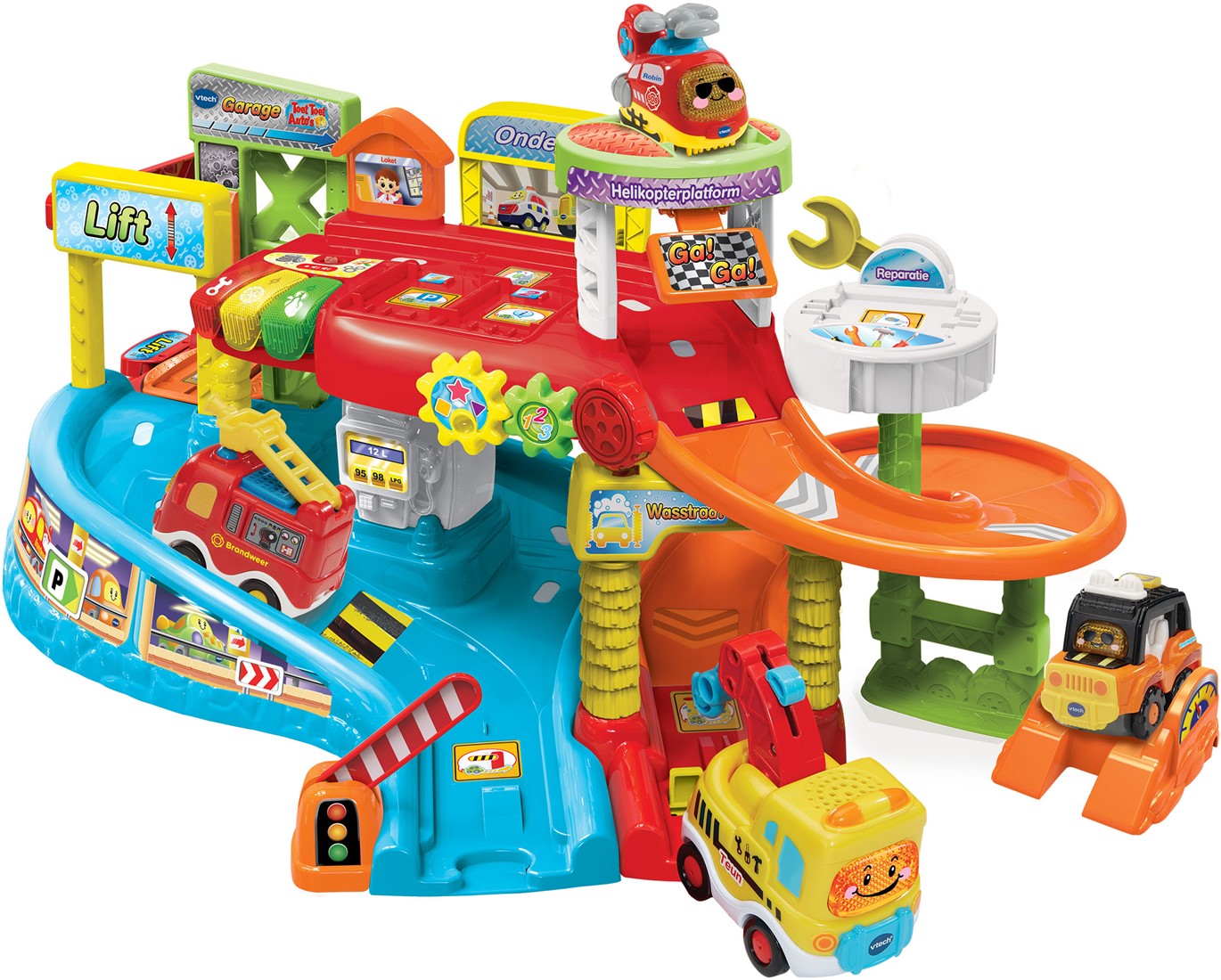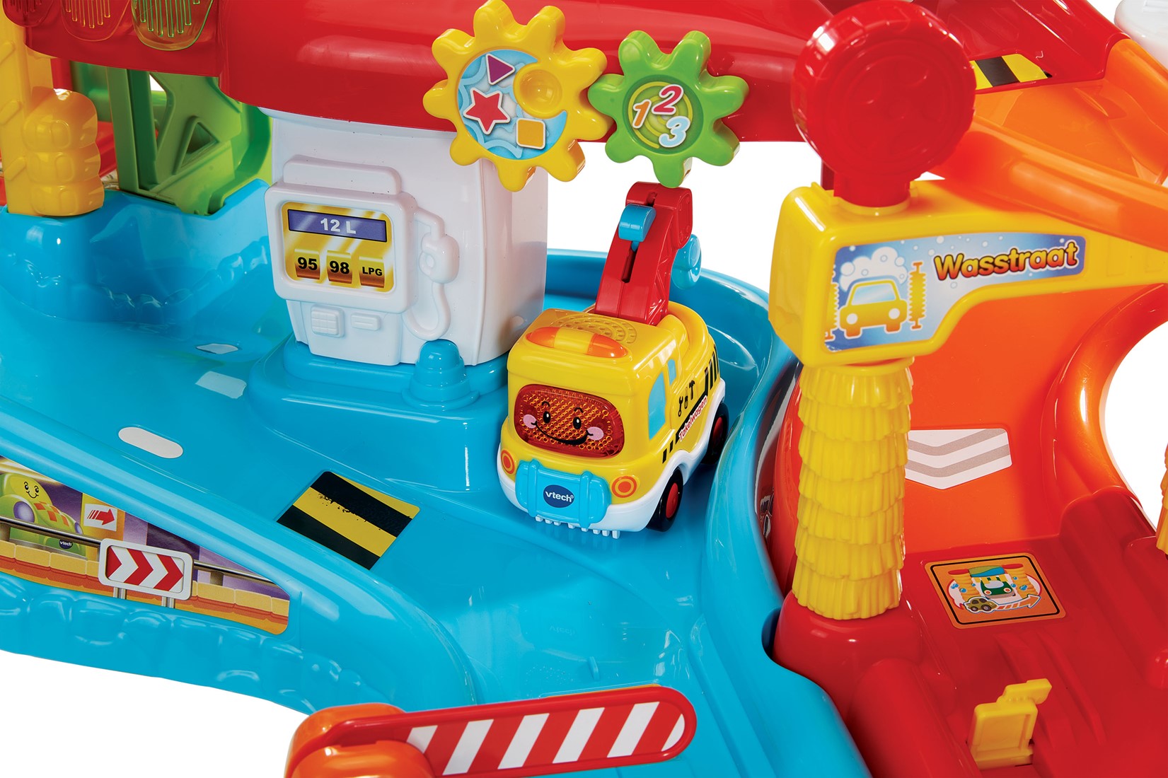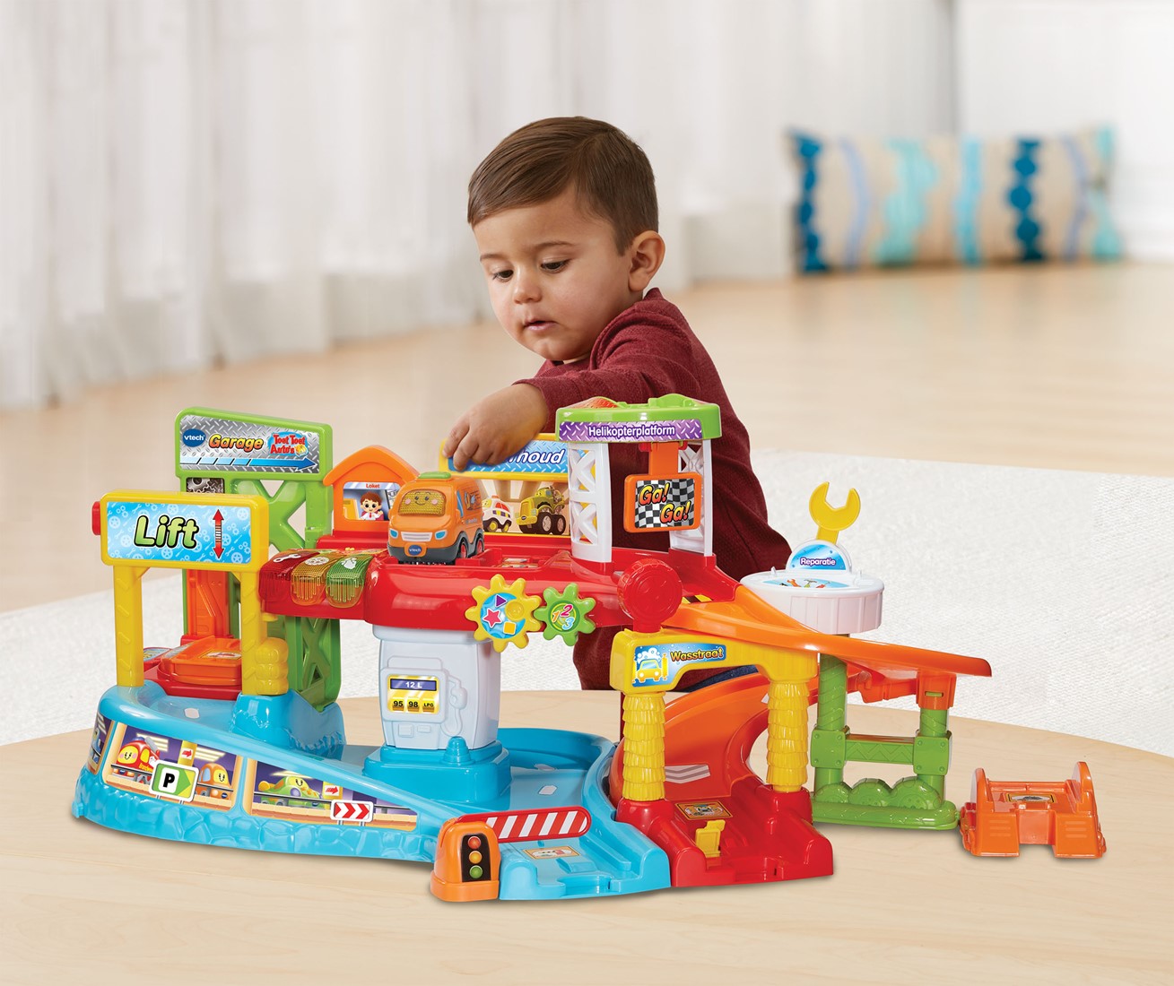 Rijd maar rond en maak plezier, want iedereen is welkom hier! Plaats Teun Takelwagen of andere Toet Toet Auto’s op de lift en beweeg de lift naar boven om het platform te zien draaien en het voertuig naar het parkeerdek te brengen. Druk op de knipperende toetsen om vrolijke reacties te horen en kennis te maken met kleuren. Rijd met een voertuig door de wasstraat of ga voor een onderhoudsbeurt naar het reparatie-platform. Verbind de garage met andere speelsets voor nog meer speelplezier.