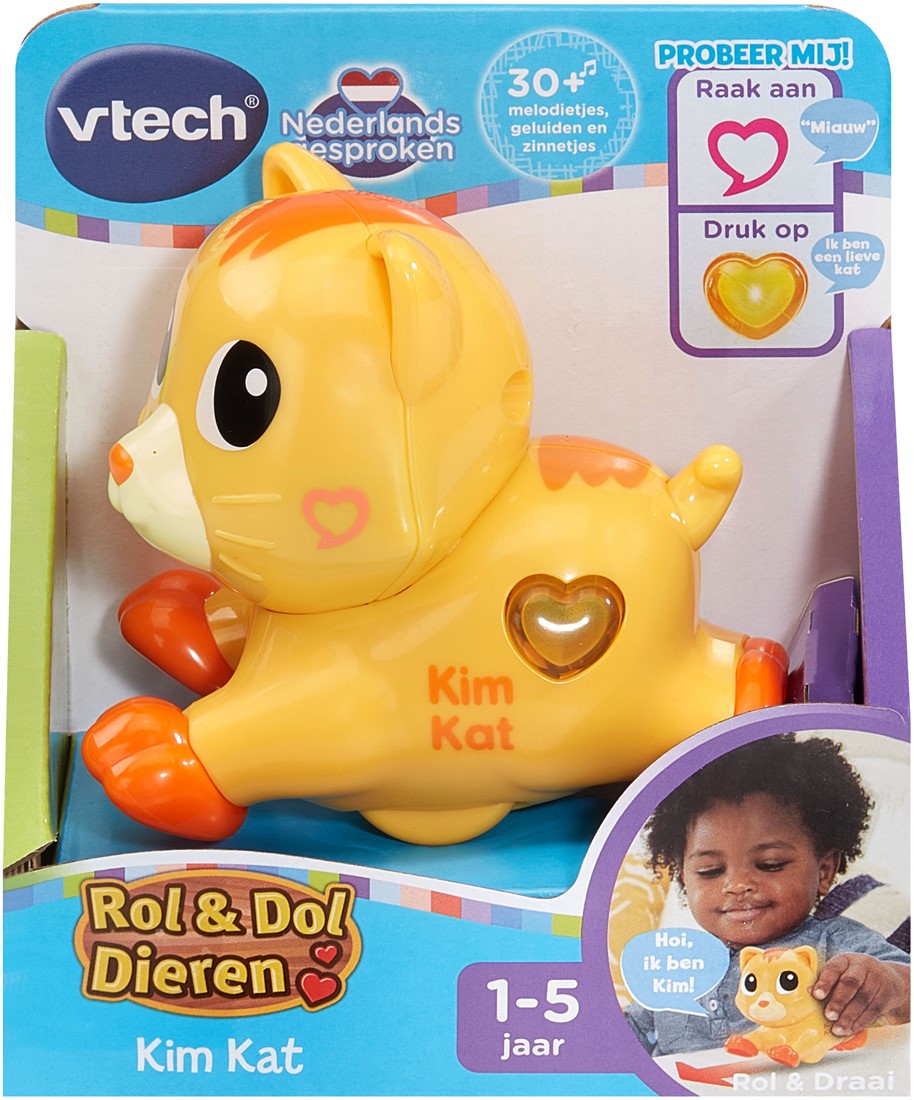 Ontdek de Rol & Dol Dieren en maak kennis met Kim Kat! Druk op het hartje voor leuke weetjes en raak haar wang aan voor een kusje, miauw of giechel. Laat Kim vrolijk rollen en draaien over de grond, ze kan niet wachten om met jou te spelen!