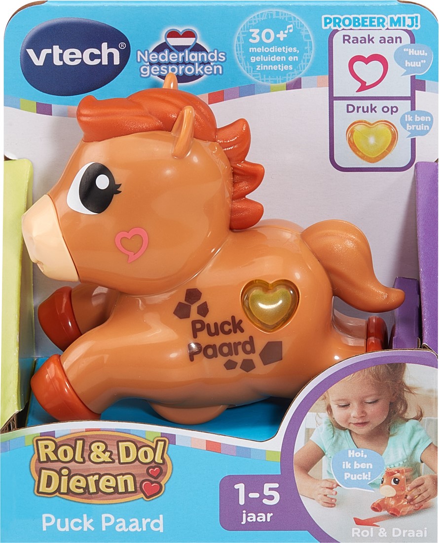 Ontdek de Rol & Dol Dieren en maak kennis met Puck Paard! Druk op het hartje voor leuke weetjes en raak haar wang aan voor een kusje, hinnik of giechel. Laat Puck vrolijk rollen en draaien over de grond, ze kan niet wachten om met jou te spelen!