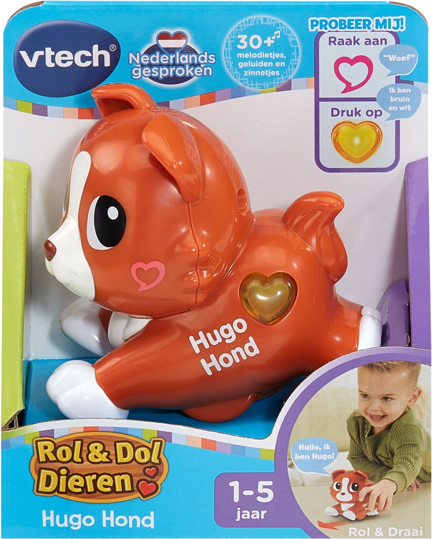 Ontdek de Rol & Dol Dieren en maak kennis met Hugo Hond! Druk op het hartje voor leuke weetjes en raak zijn wang aan voor een kusje, blaf of giechel. Laat Hugo vrolijk rollen en draaien over de grond, hij kan niet wachten om met jou te spelen!