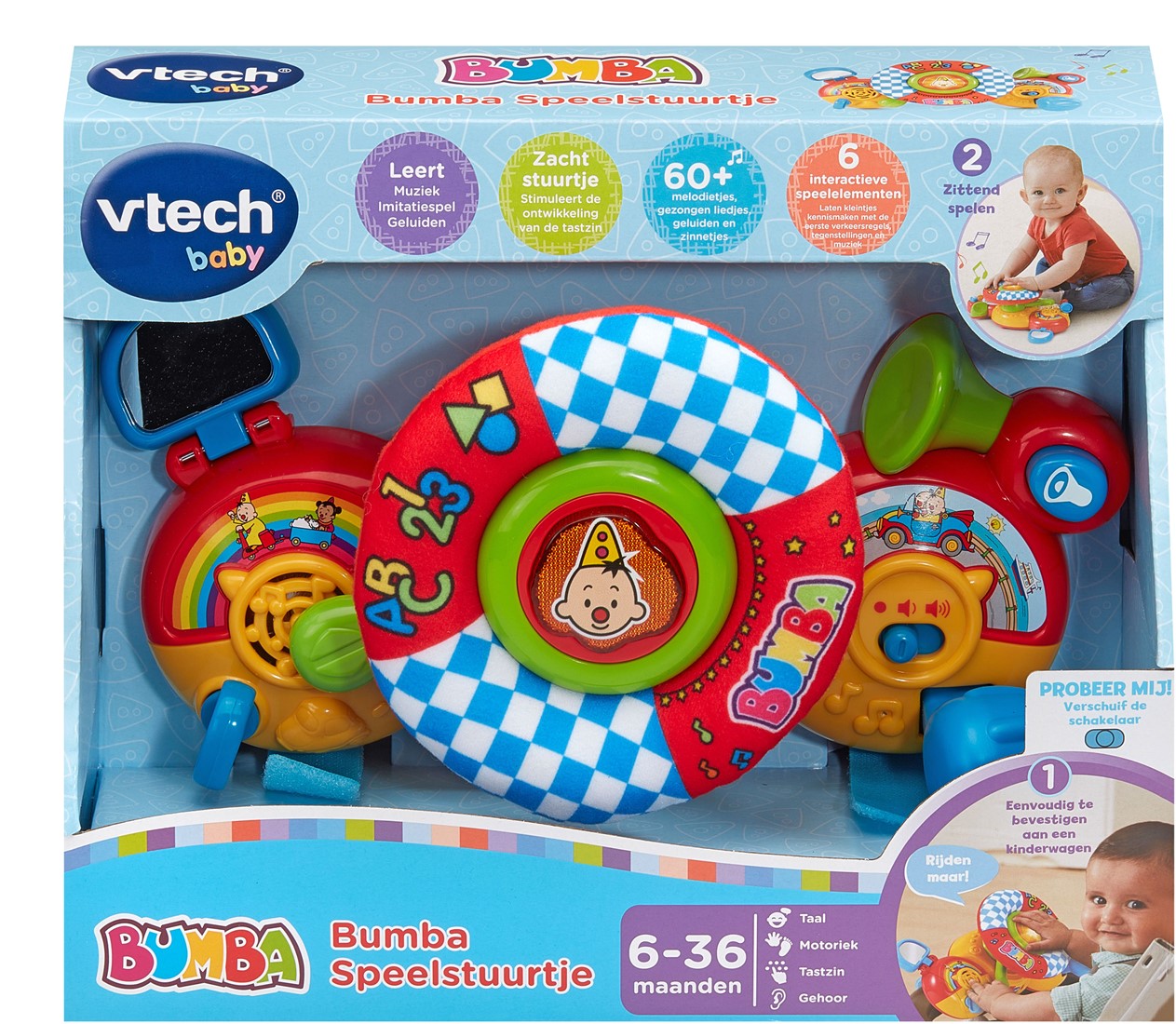 Doe je gordel maar om! We gaan op ontdekking met het Bumba Speelstuurtje! Dit stuurtje bevat 6 interactieve speelelementen die kleintjes laten kennismaken met eenvoudige verkeersregels, tegenstellingen en muziek! Het drukken op de toetsen en het bewegen van de verschillende speelelementen activeert vrolijke reacties van Bumba en Bumbina, draagt bij aan de ontwikkeling van de motorische vaardigheden en prikkelt de fantasie. Rijd maar mee met Bumba en zijn vriendjes!