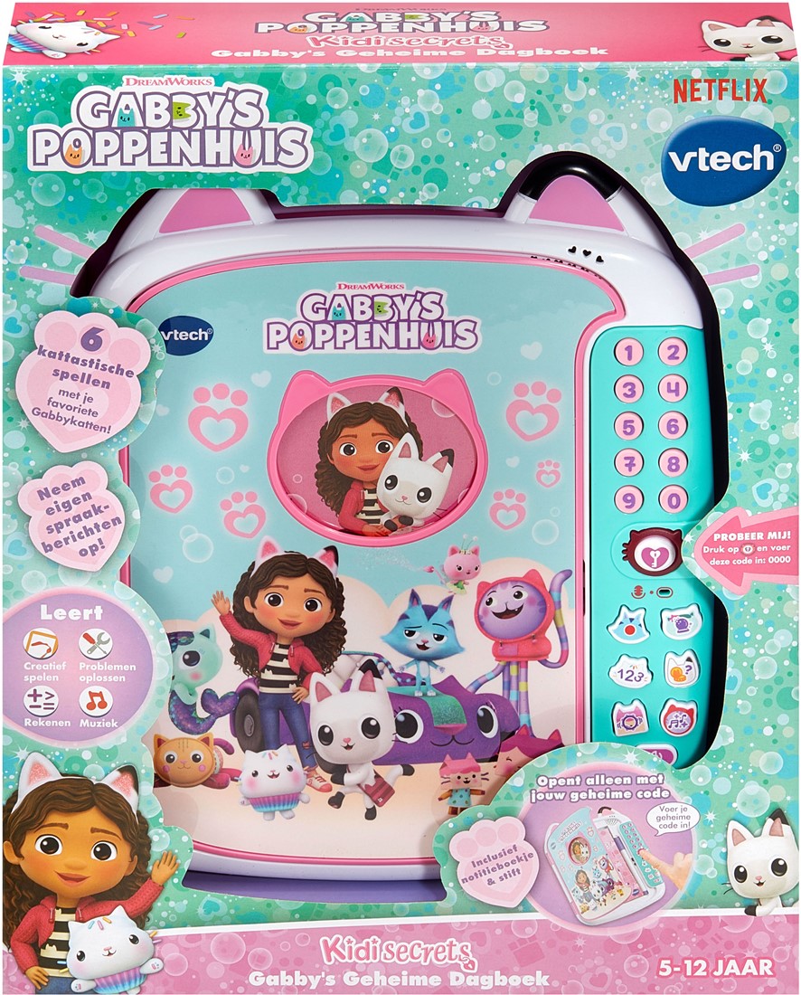 Bewaar al je geheimen in Gabby's Geheime Dagboek. Alleen jij kunt dit dagboek openen met een geheime toegangscode. Schrijf al je geheimen op in het notitieboekje en bewaar je spulletjes in de geheime lade. Speel 5 kattastische spellen met Gabby en haar katten en luister naar 10 ingebouwde melodietjes met DJ Kattenkruid!