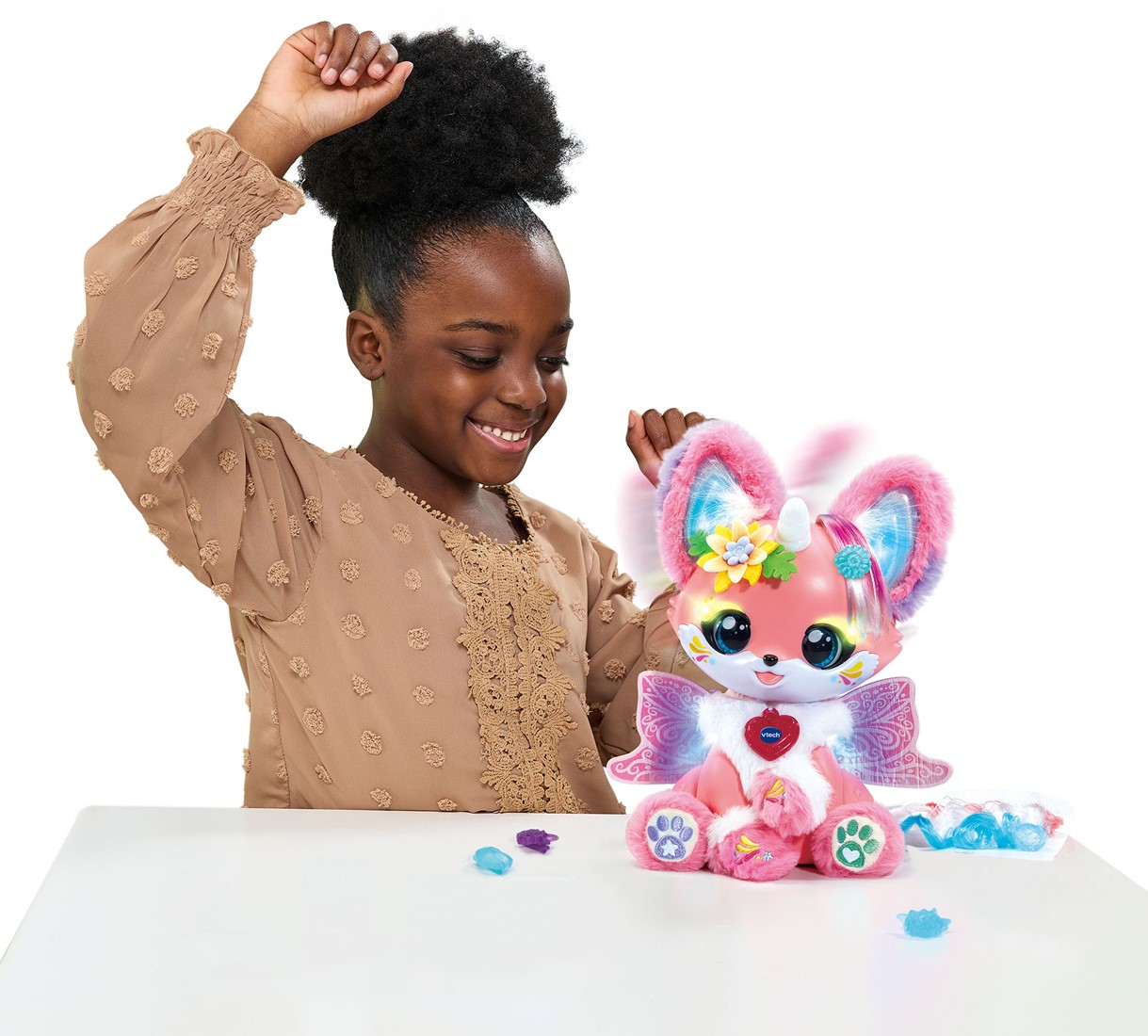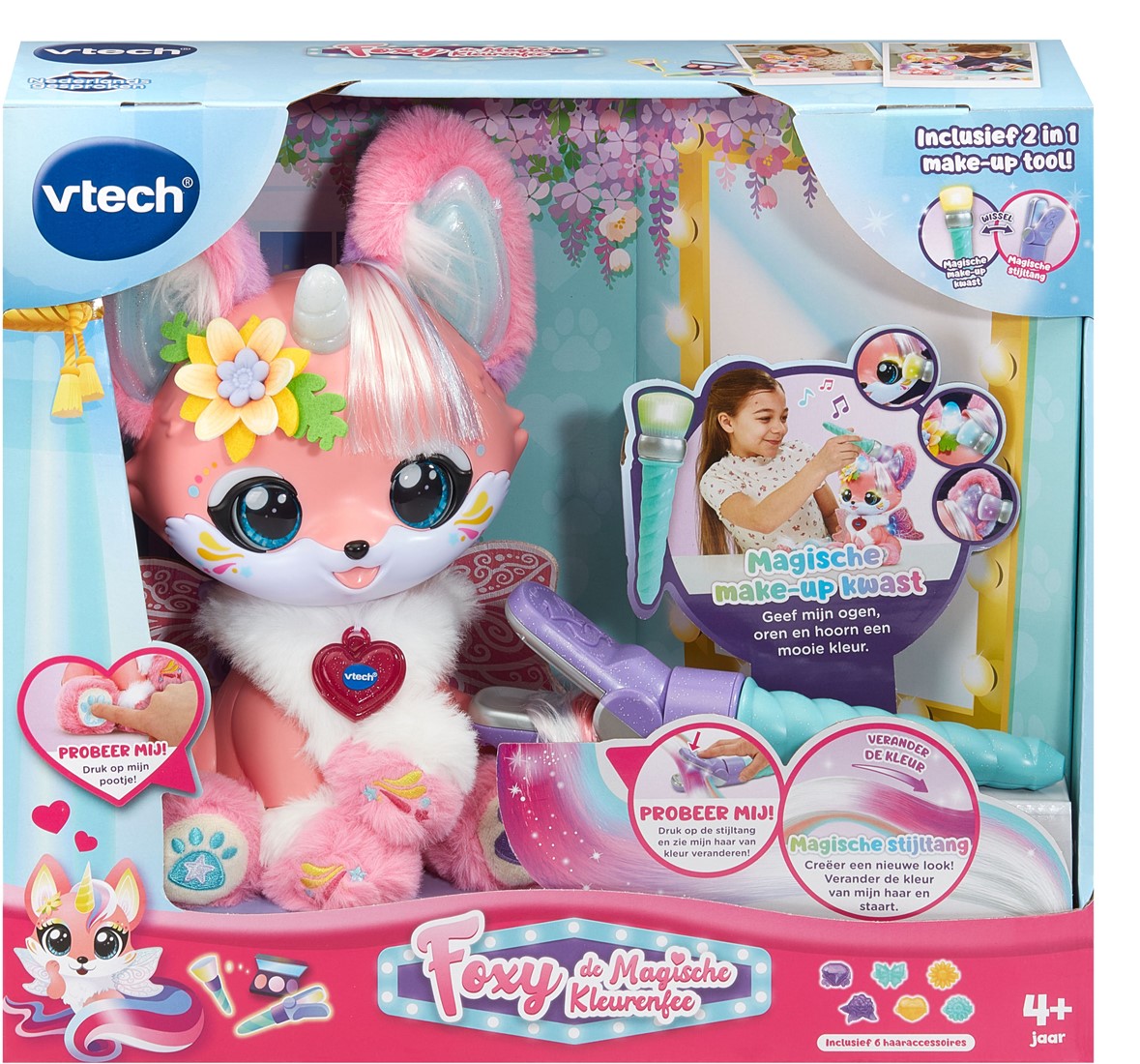 Tijd om te zingen, spelen en stylen met Foxy! Gebruik de magische stijltang om haar haarkleur te veranderen of gebruik de magische make-up kwast om foxy een nieuwe look te geven! Draai de ring van de magische kwast om de kleur te veranderen en raak Foxy's ogen, oren en hoorn aan om de make-up aan te brengen. Speel uitdagende spellen, dans, zing en laat Foxy je vragen beantwoorden! Tijd om te schitteren en stralen!