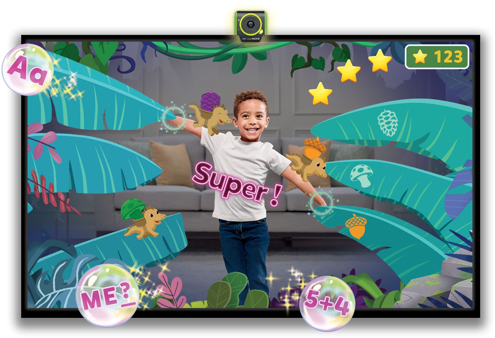 Je hebt geen controller nodig, alleen jouw eigen bewegingen! Spring, dans, vlieg, buk en beweeg om de spellen te spelen en op een ongelooflijk avontuur te gaan! Ontwikkel je vaardigheden terwijl je speelt en beweegt. Leer rekenen, letters, letterklanken, vormen, kleuren, problemen oplossen en nog veel meer! Word zelf de held van het spel tijdens 25 spellen en avonturen! Tijd om te bewegen, leren en spelen!