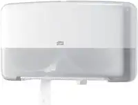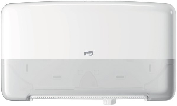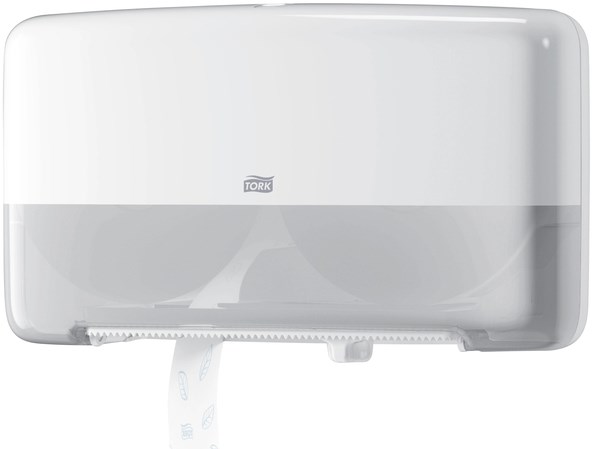 • Met de Tork Twin mini jumbo toiletpapier dispenser T2 wit heb je een modern design voor toiletruimtes met een hoge doorstroom.
