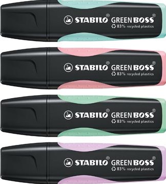 • De STABILO GREEN BOSS Pastel is een tekstmarkeerstift gemaakt van 83 % gerecycled kunststof voor scholieren, studenten, leerkrachten en kantoormedewerkers met aandacht voor het milieu.