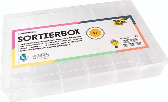 Deze handige opbergdoos van Folia is ideaal voor het opbergen van kleine kantoorartikelen of knutselmateriaal. Met 17 vakken biedt deze box voldoende ruimte voor al je spullen. De box is vervaardigd uit duurzaam, breukvast en waterafstotend polypropyleen kunststof en beschikt over een afneembaar deksel met stevige kliksluitingen voor een veilige afsluiting. Dankzij de ingebouwde handgrepen is de box gemakkelijk te tillen en te verplaatsen. Bovendien is de box stapelbaar en transparant, zodat je direct zicht hebt op de inhoud.