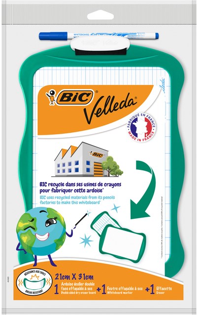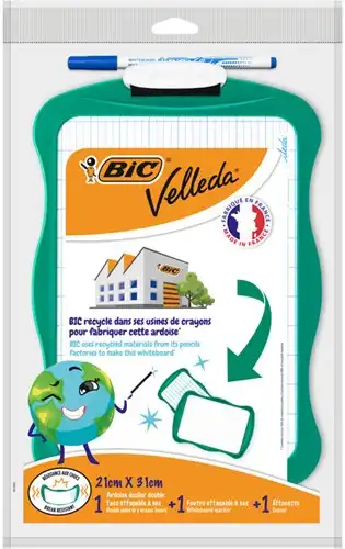 Dit lichte en zeer stevige mini whiteboard van Bic Velleda is perfect voor kinderen. Het is gemaakt van gerecycleerde Bic pennen en bevat een dubbelzijdig whiteboard, een uitwisbare whiteboard stift met blauwe inkt en een magnetische wisser. Het is ideaal voor tekeningen, rekensommen en het leren schrijven.