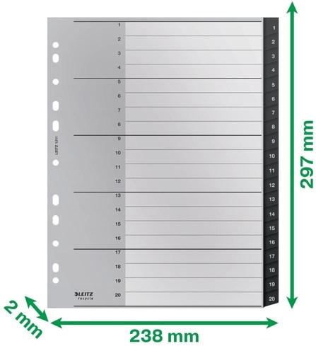 Specificaties tabblad Leitz Recycle A4 11-gaats 1-20 extra breed PP