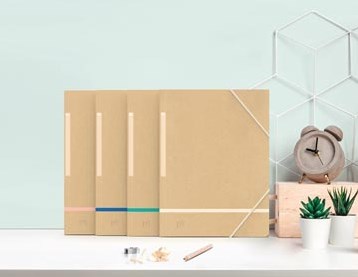 Voor ft A4 (24 x 32 cm). Uit 100 % recycleerbaar karton van 450 g/m². Natuurlijke kleur, zonder toevoeging van kleurstoffen en chloor. Met 3 kleppen en elastosluiting. Met rugetiket. Capaciteit: 200 vel. PEFC-gecertificeerd.