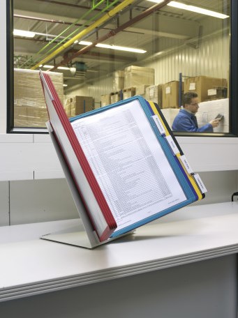 Met de Durable bureaustandaard houd je je prijslijsten, folders en documenten overzichtelijk op je bureau. Deze standaard heeft 20 insteekhoesen die zijn afgewerkt met een antireflectielaag voor een perfecte leesbaarheid. Dit maakt het eenvoudig om belangrijke informatie te tonen en te presenteren.