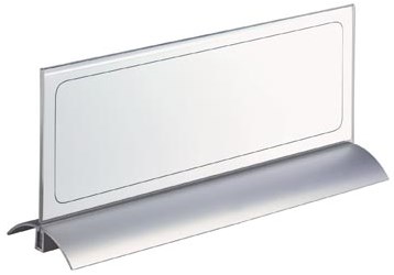 Uit heldere acryl met aluminium voet. Het uniek klemsysteem zorgt ervoor dat het acryl plaatje goed op zijn plaats blijft en het insteekkaartje gemakkelijk kan worden vervangen. Compleet met verwisselbare blanco insteekkaartjes. Ft 105 x 297 mm. Doos van 1stuk.