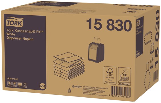 • De Xpressnap Fit® Dispenserservet wit N14 geschikt voor de Tork Xpressnap® Fit-"Signature Line" Tabletop- en Counterdispensers.