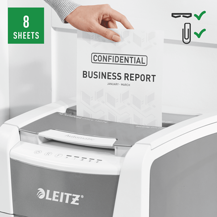 Volledig Automatische papierversnipperaar met een autofeed voor 150 vellen. Wil je handmatig papier vernietigen? Dat kan ook via de handmatige in voer waarbij je 8 A4 vellen (80 gsm) tegelijkertijd versnipperd. Deze shredder versnippert veilig tot veiligheidsniveau P4 in kleine snippers van 4 x28mm. De grote opvangbak van 44 liter is uit te nemen en gemakkelijk te legen. Anti-vastloop technologie, De papiervernietiger stopt automatisch en draait terug als er teveel papier is geplaatst.