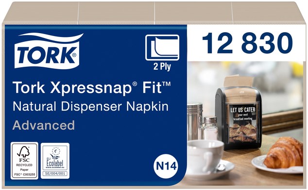 • De Xpressnap Fit® Dispenserservet Naturel N14 geschikt voor de Tork Xpressnap Fit® "Signature Line" Tabletop- en Counterdispensers.