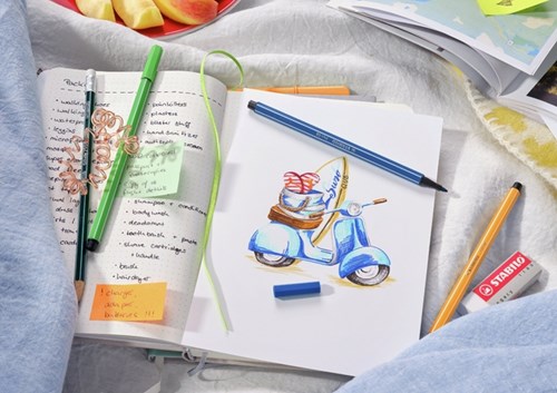 • De Pen 68 is verkrijgbaar in heel veel prachtige heldere kleuren, waaronder ook neon- en pasteltinten. Deze diversiteit zorgt voor non-stop creativiteit - daarom past de STABILO Pen 68 perfect bij de huidige trends als handlettering, journaling of sketchnotes. Ook fans van mandalakunst en iedereen die liever tekent of schildert zijn enthousiast over de veelzijdigheid van deze hoogwaardige viltstift. De robuuste punt zorgt voor een constante kleurafgifte en is perfect om gemakkelijk krachtige lijnen mee te zetten of grotere vlakken in te vullen. De punt kan tot 24 uur zonder dop zonder uit te drogen - perfect om lekker door te kunnen werken aan je creatieve project. De kleuren kunnen worden gemengd met water voor prachtige aquareleffecten. De Pen 68 is vanaf heden duurzamer dan ooit: vanaf heden is de dop en penbehuizing gemaakt van 96% bio-gebaseerd kunststof volgens massabalans benadering.