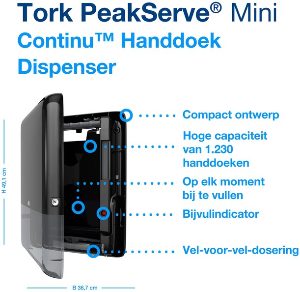 • Tork PeakServe® Mini Continu™ Papieren HanddoekDispenser de nieuwste innovatie voor drukbezochte toiletruimtes, waar de doorstroom van de gasten essentieel is.