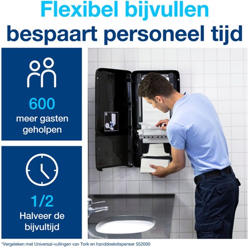 • Deze slanke handdoekdispenser heeft tot 250% hogere capaciteit dan de reguliere Tork handdoekdispensers.