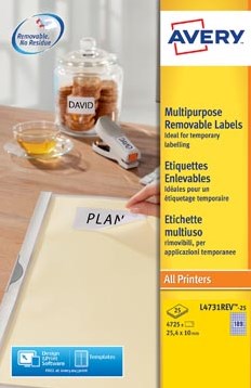 AVERY afneembare witte etiketten Stick & Lift ft 25,4 x 10 mm, 4.725 stuks, 189 per blad