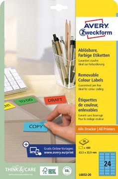 AVERY afneembare, gekleurde etiketten ft 63,5 x 33,9 mm, 480 stuks, 24 per blad, blauw