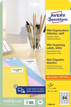AVERY mini-etiketten ft 46 x 11,1 mm, 2.100 stuks, 84 per blad, doos van 25 blad, voor laser- en inkje...