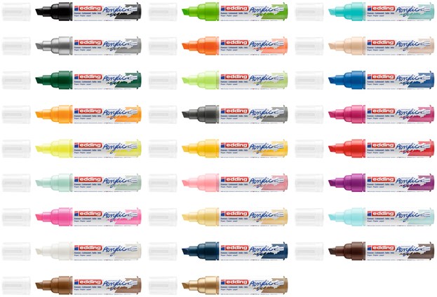 Verkrijgbaar in 26 verschillende kleuren, in verschillende schrijfbreedtes.