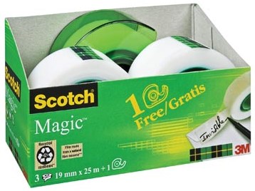 Onzichtbaar. Beschrijfbaar. Op fotokopieën is er van de plakband geen spoor te vinden. Ft 19 mm x 25 m. Met gratis navulbare handdispenser. 3 rollen Scotch® Magic Tape.