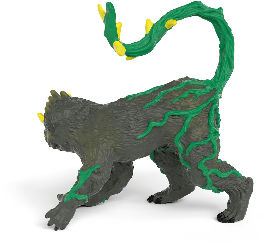 De junglechimpansee heeft lelijke gele ogen waarmee hij zijn tegenstander kan fixeren. Zijn krachtige gebit ziet er indrukwekkend uit en zijn lange lianenstaart is bezet met gevaarlijke gele stekels. Daarmee zwaait hij behendig van tak naar tak en is hij net zo snel weg als hij er was. Jakkes!