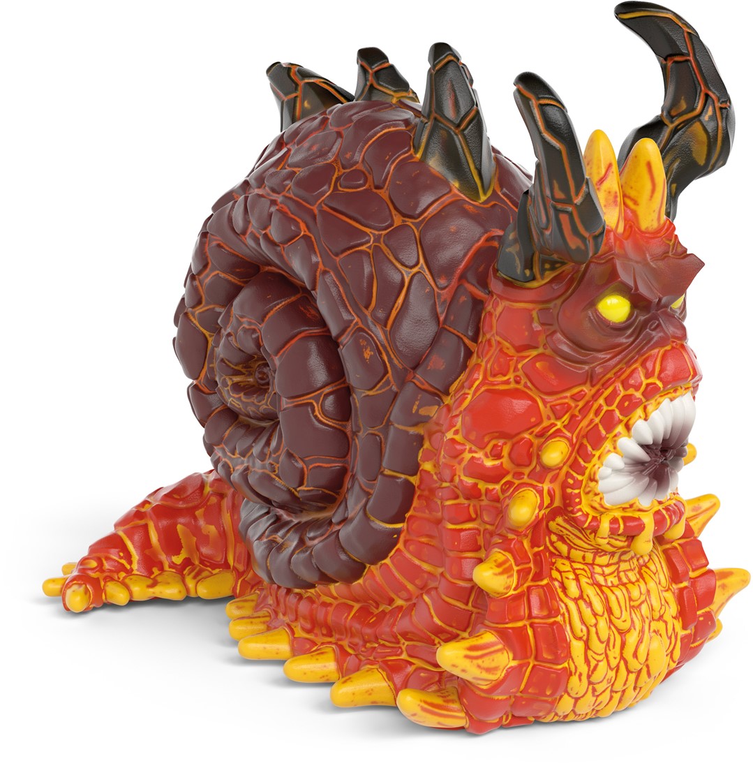 O nee, wie komt daar aan gekropen? De lavaslak ziet er angstaanjagend uit! Haar oranje-rode lichaam is overal bezet met stekels en haar slakkenhuis bestaat volledig uit doornen. Haar bek met de puntige tanden is enorm angstaanjagend. Snel weg hier!