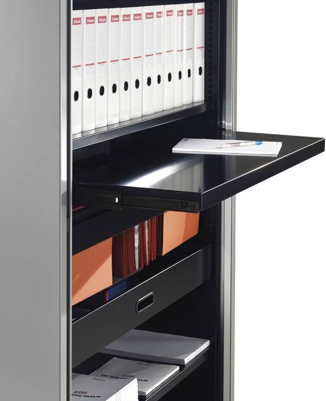 Uittrekbaar legbord voor Roldeurkast CHS 120cm breed is geschikt voor het inhangen van laterale A4 hangmappen en het plaatsen van ordners.