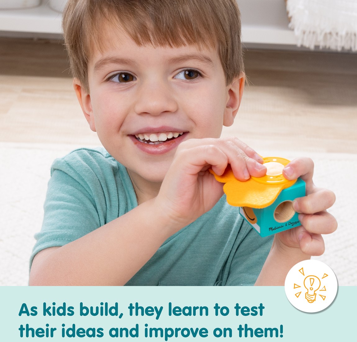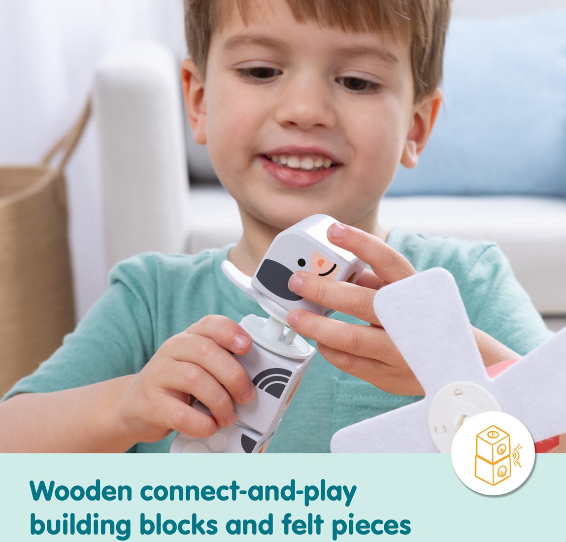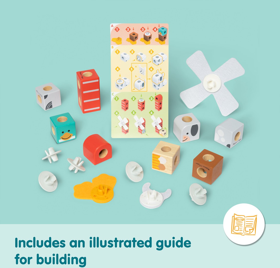 Ontdek Blockables – de nieuwste speelgoedinnovatie van Melissa & Doug! Deze massief houten speelblokken met klikbare verbindingsstukken zijn ontworpen om bouwen, fantaseren en leren moeiteloos te combineren. De vrolijk gekleurde blokken klikken stevig op elkaar en zijn speciaal gemaakt voor kleine kinderhandjes. Zo bouwen kinderen vanaf 2 jaar zelf een geit, eend, eieren en zelfs een draaiende windmolen – óf hun eigen knotsgekke boerderijwezens!